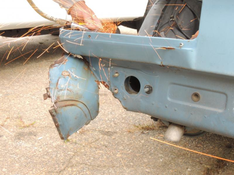 Got some more work done today for welding the quarter panel to the car. Since welding will need to be done to the back of the car, the bumper needed to be removed. Looks interesting without it