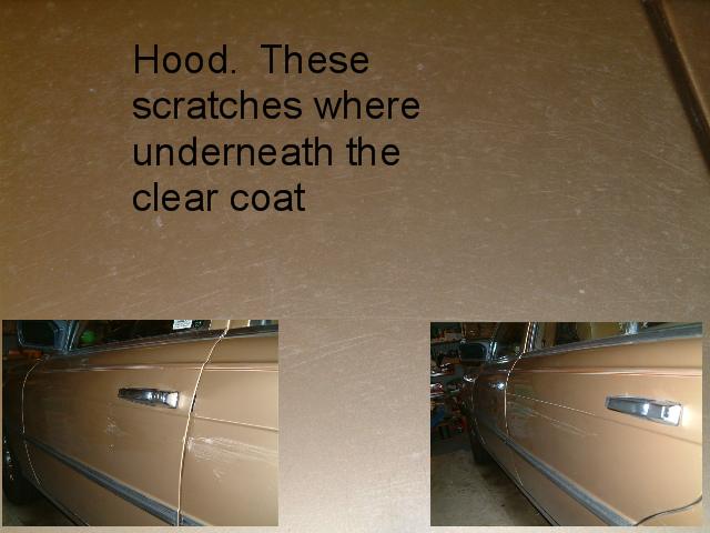 Also I would think that the hood problem is the clear coat starting to fail - the only fix is to respray -- the hood is often the first to show this, followed by the roof and trunk and the tops of the fenders. |