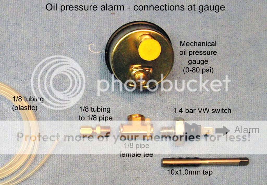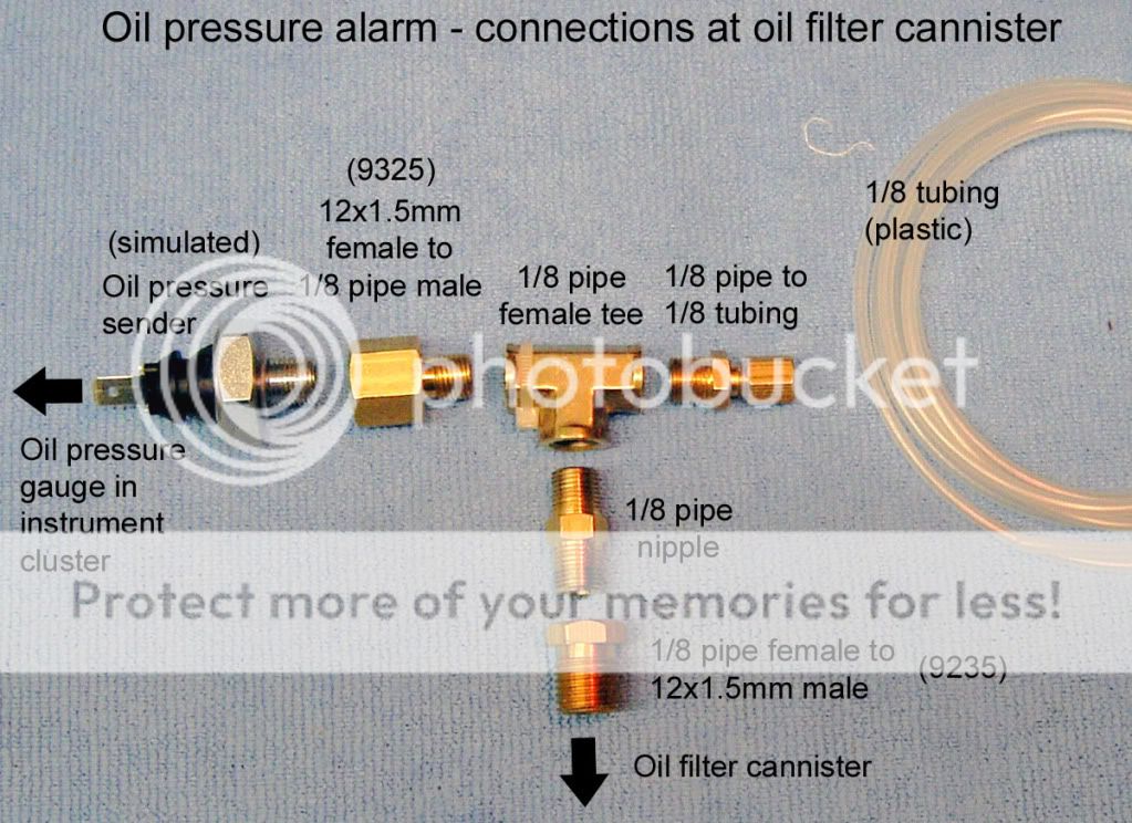 The first picture shows the components needed to tee into the port on the oil filter cannister where the electric oil pressure sender connects. This will work on any Mercedes engine that uses a sender with a 12x1.5mm thread. One side of the tee accepts the electric sender and the other side adapts to 1/8" tubing. The two fittings that may take a bit of finding are the two metric adapters. The hydraulic and plumbing catalogs use the numbers "9325" and "9235" for these two parts as shown in the first picture. Some auto parts stores may stock these adapters or be able to order them and there are many on-line sources. ![]() The second picture shows the connections at the other end of the plastic tubing. The tubing goes into another tee to which is connected the VW 1.4 bar switch and a mechanical oil pressure gauge. One leg of the tee needs to be re-tapped with a 10x1.0mm Metric tap for the VW switch. Although the (metric) VW switch will screw into the (NPTF) tee part way, the threads are incompatible and the junction may leak. Retapping the 1/8 NPTF threads to 10x1.0mm metric is a trivial task -- the threads and diameter are very similar. The gauge and VW switch can be mounted under the hood (my choice) or in the cabin where the driver can see the gauge. Be sure to run the plastic tubing inside a larger piece of tubing for protection against abrasion, cuts, and pinching. ![]() For those who don't want to bother with a gauge, the tee in the first picture can be modified so the electric sender screws into one leg and the VW switch screws into the other. I'll post the electrical half of the alarm when I finish installing the plumbing in my '87. Jeremy