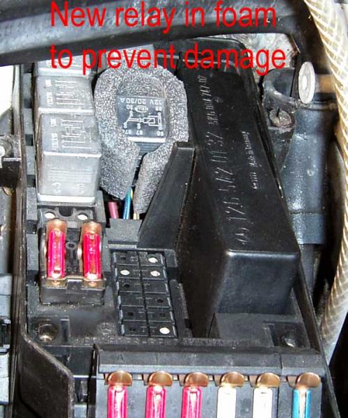 The relay I chose is a standard Mercedes relay made by Hella (I didn't re-use the relay from the earlier part of this DIY). The relay came from an old Benz in the local junkyard. I made a socket for it from a six-pin Mercedes plug that was left over from my European headlight project. Only four of the six pins were used. After removing both covers from the fuse/relay box, I pulled out N10, the "combination relay" to make room to see what I was doing. The afterglow relay sits in the empty location but its socket isn't attached like the other sockets are. I put a piece of foam pipe insulation around the relay so it wouldn't rattle around. The four wires from the afterglow relay run through the fuse/relay box and out the front of it. The two wires from the relay coil (terminals 85 and 86) run to Y29, the transmission vacuum amplifier switchover valve. The other two wires connect terminals 30 and 87a (common and normally closed contacts) to the glow plug relay, where they split the famous "violet wire." A cold engine means that S25/6, the 50C temperature switch in the water jacket, is closed. This sends power to the afterglow relay, cutting the violet wire and keeping the glow plugs energized for the full 30 seconds (in my car) regardless of how long I wait before starting the engine. Once the engine warms up past 50C, S25/6 opens, the afterglow relay closes, and the violet wire works normally – the glow plugs turn off once the engine starts. Suggestions: 1. Disconnect the battery before tearing the fusebox apart. 2. The main cover to the fuse/relay box is held on with six captive screws. Each screw has a fiber washer that holds it to the cover. These often get lost or damaged and should be replaced if you can find new ones. 3. With the covers off, remove one screw at the front of the fuse holder (the rear is hooked onto the relay box – tilt the fuse holder up and it will unhook). 4. I don't recommend undoing all of the fuse wires. Just pull the fuse holder out of the way and tie it to something. I used a shock cord. 5. Use tubing to enclose the wires. This makes for a neat appearance and protects the wires from accidental damage. 6. Remember to put N10 back before you put the covers back on the fuse/relay box. 7. Now reconnect the battery and test your installation. While I had the fuse/relay box open, I removed and stored K2, the headlight washer relay. When I installed Euro headlamps I removed the headlight washer system. Since the wires are still in the car, removing the relay prevents a short circuit. Jeremy