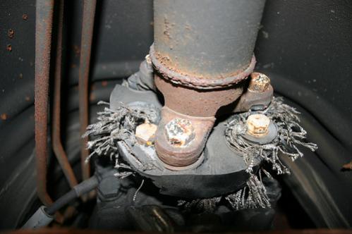Well, I finished everything this evening. Yesterday I spent most of the day removing/replacing the bushings at the ends of the driveshaft (that included two trips to Lowes and a trip back to my house). I drilled a hole in each one, per Haynes manual procedure (bought a new set of Bosch drill bits that could handle the thickness), stuck a mini allen wrench through it and tried to pry it up using screwdrivers with the shaft in a vice. Upgraded to giant pry bars, no go. So I bought a torch and heated it ... they came right out. You can see the damage on the front one. ![]() ![]() Today I put the center support back on, had to tap it on using a wide PVC pipe. The real tough part was torquing on the 12 bolts for the flex discs. My torque wrench is too big, everything kept slipping, and I had no space under there. Plus I have the strength of a preteen girl. But, I toughed it out and got them all done, despite lying in what was clearly not just mud under the back of the car. Took it for a drive, everything seemed OK. But here's the kicker (you knew it was coming, right?). When I was cleaning up a I picked up one of the old bolts, which still had the washer on it ... and realized I put the washer on the wrong side of every single bolt (i.e., I put it under the nut. Why? I have no idea). I doubt that will lead to immediate catastrophic failure, but the washers go under the bolt heads for a reason, and I have to go back and re-do all 12 bolts. It makes me so mad, because if I'd stopped and thought about it, logic alone would compel me to put the washer under the bolt head. And I was so careful about everything else. Oh well, it could be worse ... at least it doesn't look like this anymore ... ![]()