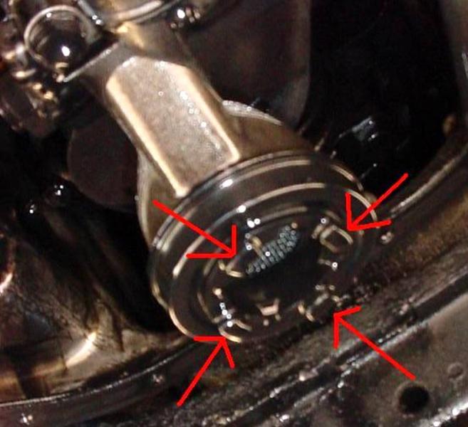 After Jacking an putting a Jack Stand on the Passenger side of the Car I Jacked the Drivers side up resulting in the near disaster of the who Car sliding a crossed the Jack Stand towards the Passenger side. Red arrow in the pic shows were the Jack Stand was and you can see where it ended up. I more carefully jacked the Car up and got it safely on the jack stands. The Oil Pan was removed without incident. I found there was actually impressions of the Oil Pump Inlet left on the dented Area of the Oil Pan. (pics and Red Arrows ) The Prior Owner came very close to cracking the Oil Pump Inlet. I loosened the A/C Hose Bracket to gain a little more room and removed the Air Filter Housing. Despite what I have read it was easy to get at the Turbo Drain Bolts with a ½ inc Box Wrench. (pic)