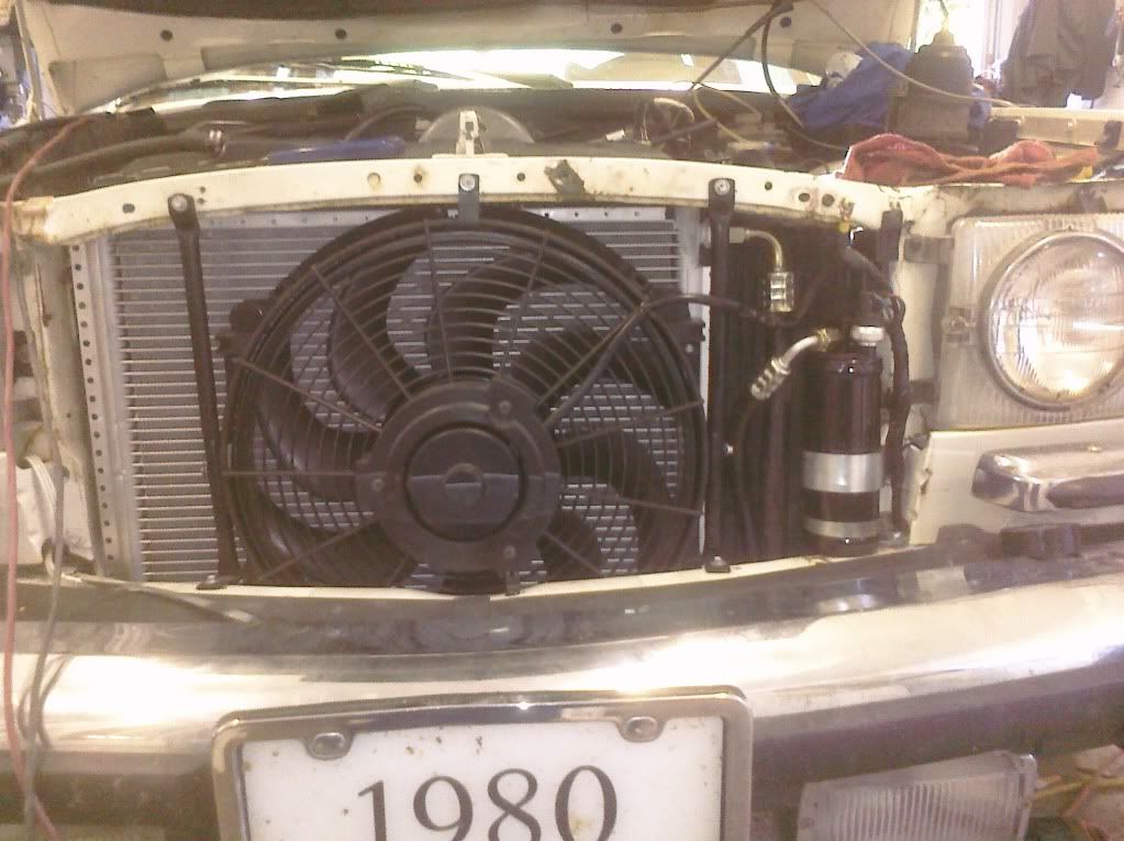 ![]() The fan quieted down quite a bit when mounted and it throws a lot of air through the condenser. 16" X 20" condenser from ebay (#8 inlet, #6 outlet) and a 16" fan from the parts store...