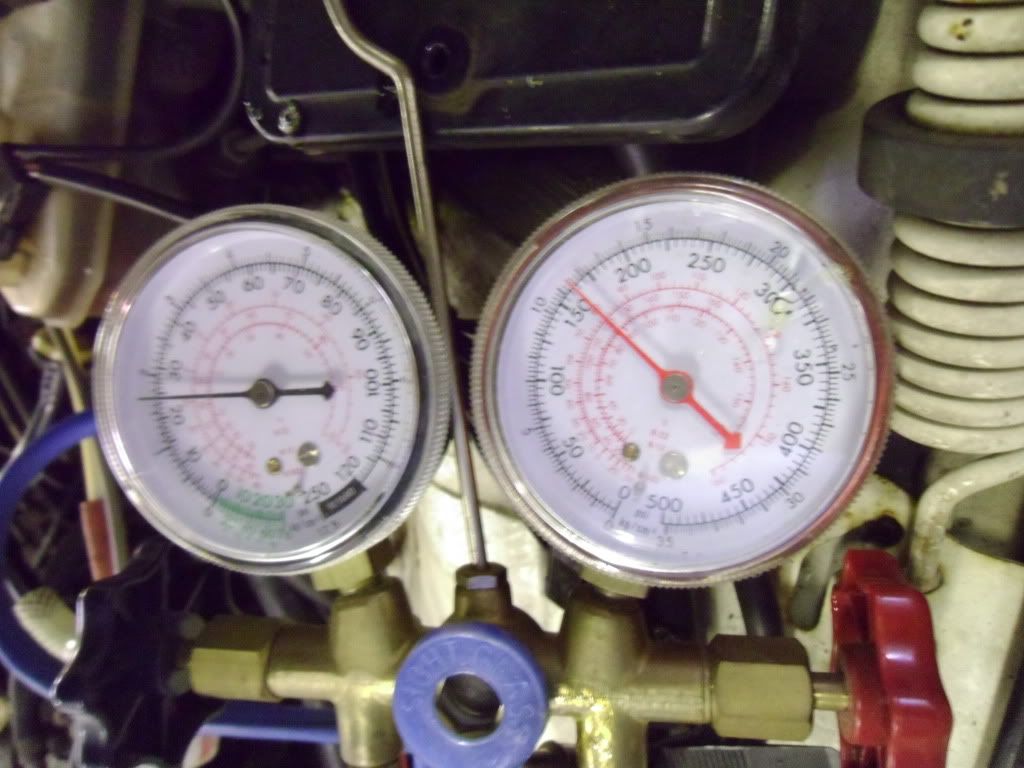 Ambient 72F I got 72 psi when the gauges were hooked up. Compressor ON fan on high, doors open... lo 15 psi high 130 psi. It rose to 17/140 after 5 minutes of running. Temp at center vent 39 F. 1500 RPM: Lo dropped to 10 psi and hi rose to 150 psi. After it returned to idle the pressures stabilized at 15/140. Vent temp was 37 F. The low pressure is getting pretty close to the low pressure shut off but it hasn't cycled that I can tell. Better than being close to trippin' the hi pressure switch!