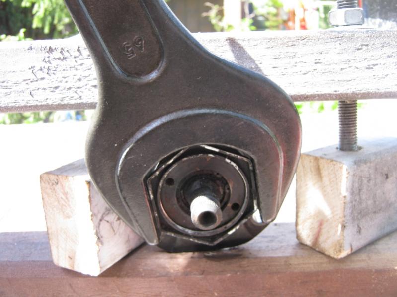 Starting with the steering nut. Assemble the bearing and bearing race in the bottom of the working piston assembly... http://www.peachparts.com/shopforum/...1&d=1313055732 http://www.peachparts.com/shopforum/...1&d=1313055810 http://www.peachparts.com/shopforum/...1&d=1313055851 ...fit the steering nut and tighten with use of your special tool (home made socket – or MB tools) so that the torque required to move it is in the range of 6-10Ncm... http://www.peachparts.com/shopforum/...1&d=1313060357 http://www.peachparts.com/shopforum/...1&d=1313055466 A tip for this bit is not to bother too much about clamping the working piston – work the self made socket against a 35mm socket and T bar. Tighten the 8 sided nut to 200 – 240 Nm. To do this I used my open ended 60mm spanner on one side of my self made socket and attached my old fashioned hanging scales to a hole in the end of the spanner so that I could measure the torque applied. Using the formulas given above, for a distance of 47cm between the centre of the open ended spanner's mouth and the hole on the handle, I calculated that my scales should be reading between 43 kg and 52 kg to apply the correct torque. http://www.peachparts.com/shopforum/...1&d=1313060818 Please note unlike a torque wrench, calibrating scales is quite easy to do so long as you have some known weights to test it. This might look like a bit of a dodgy way of applying a torque but if you are careful (and you have to be) you can safely apply a torque as well as you might with a torque wrench – in absence of a torque wrench – particularly if you are given a nice wide range between 200 and 240 Nm. |