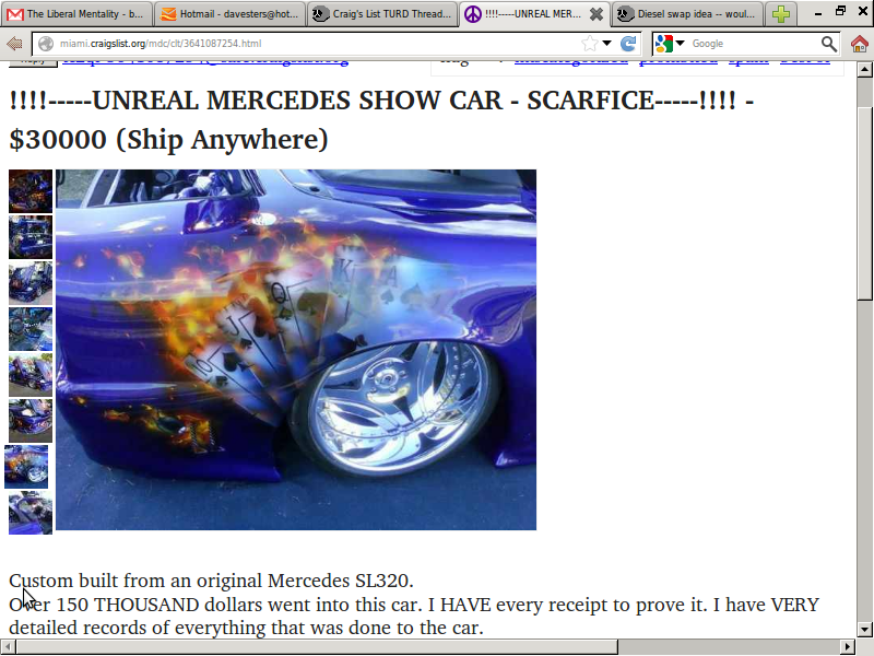 Have a look at the $ 30,000 " Gambler " SL 320, I saw pics of this car a year ago. The tag line said the owner stopped doing drugs / drinking and put his eforts in to the car. I say yea for cleaning up his act, not so yea for the car. Pics on Craigslist don't seem to work so well with my computer so I can't post them. !!!!-----UNREAL MERCEDES SHOW CAR - SCARFICE-----!!!! !!!!-----UNREAL MERCEDES SHOW CAR - SCARFICE-----!!!! - $30000 (Ship Anywhere) Custom built from an original Mercedes SL320. Over 150 THOUSAND dollars went into this car. I HAVE every receipt to prove it. I have VERY detailed records of everything that was done to the car. Everything works, it is Street Legal. The car has WON 1st Place or Best Of Show in EVERY single show its been entered in. The car has been in a few magazines and a few write ups. There are over 4000 LED lights, 13 TV's, 3 AMP's, 6 Cameras, 1700 Watt Smoke Machine (built in), Air Bags, Flame Thrower, NOS Purge, Wii System and MANY more bells and whistles. Much 2 Much for me to list here. I will supply you with all the trophies, books, records.... everything. This is a "MUST SEE IN PERSON" Car, and I will ONLY make an appointment with serious buyers.. The car Bid up to 100,000 at Mecum Auto Auction last year in Tampa but I turned it down. Now I must sell it for personal reasons so my loss is your gain. Call Joe at 954-205-3067 DO NOT WASTE YOUR TIME ASKING ME TO TAKE ANYTHING LESS OR ANY TYPE OF TRADE. I WILL NOT. This is a "FULL BLOWN CUSTOM SHOW CAR" and heads will turn, people will lose their mind and everyone goes crazy when they see it in person. EDITED TO ADD IN PICS... |