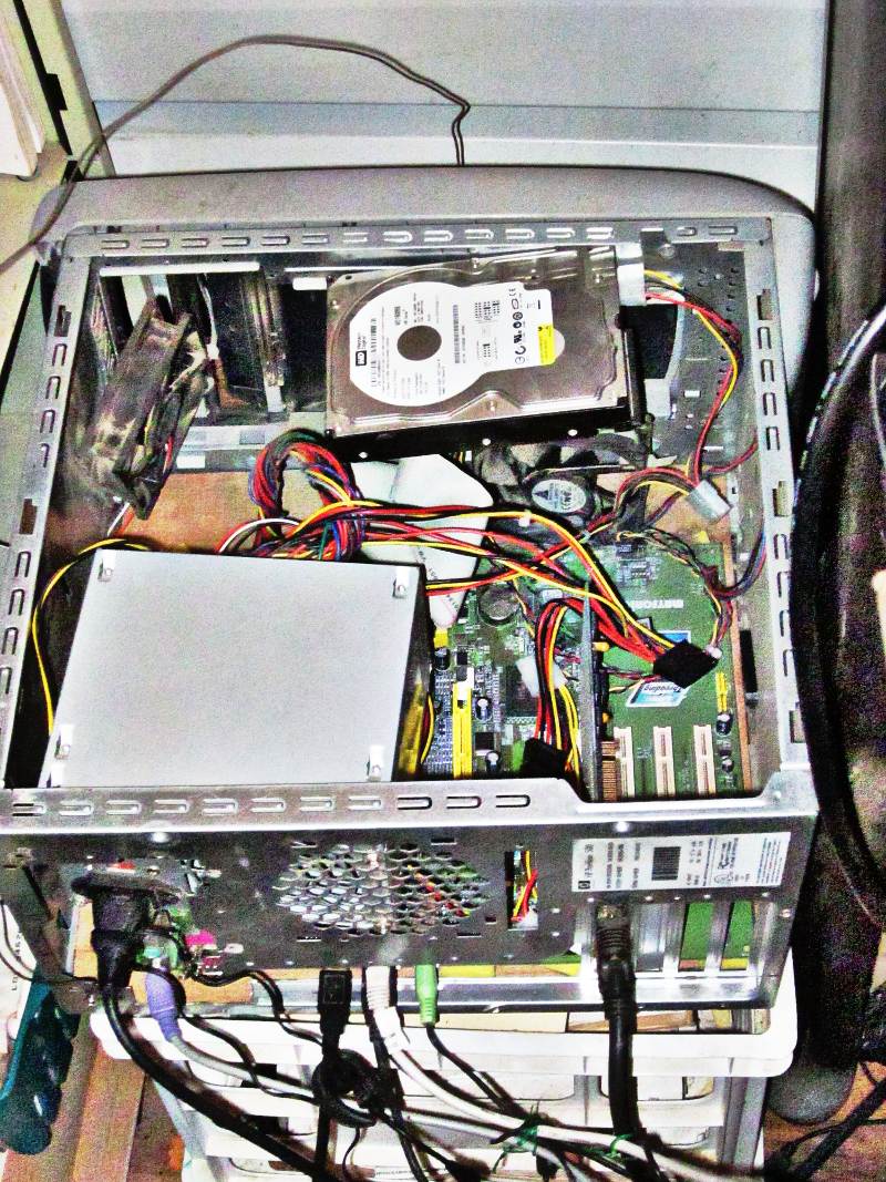 You twisted my arm. I forgot to mention that the power supply was replaced with a genuine Chinese unit after it threw a big spark internally. The main trouble with the new powersupply is that has enough electrical interference to prevent AM reception for about 100 yards around. The mother board is held to the plywood base with dry wall screws and held off it by blocks of yellow polyurethane foam.