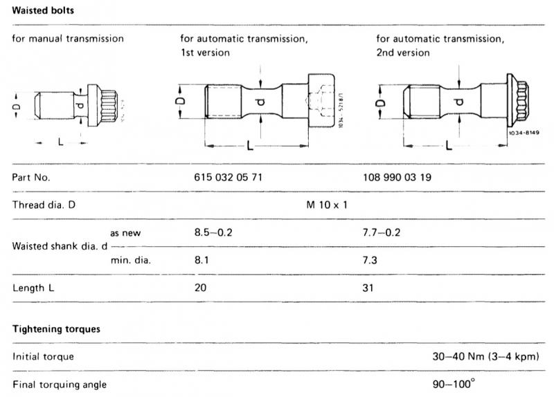 In your case, I'm betting you have more time than money, and I'm betting that you can get that transmission back out in a couple of hours if something isn't quite right. So, the trick is to replace only what you probably have to for safety and reliability. The flywheel looks pretty good in pictures, so I'd degrease it, the pressure plate, and the clutch disc with brake parts cleaner. Assuming that the disc is reasonably unworn as is the pressure plate. I would install a new pilot bearing (they're like $7), and release bearing (they're about $50). Maybe skip the release bearing if the one you have feels really smooth and you really need that $50. I would measure the waist on the flywheel bolts, see attached snipped from the factory service manual. If not within spec, get new ones ($5.95 each, I think .. ouch) and torque as specified. They stretch when you torque them and are TIGHT! Up to you, but I like to install new clutch and slave cylinder and rubber flex hose. I do this because bleeding that clutch is a booger and I'd hate to find that the reason the stupid thing wouldn't bleed was because of a leaky something or another. But again, I bet you have more time than I do. ![]() I just finished manual conversions on my '85 300TD and '76 300D, so I can definitely relate. If you haven't seen those threads, they are here: 300d 4-speed swap: are you happy with it? w115 300d 4-speed manual swap Hope this helps. -Dan
