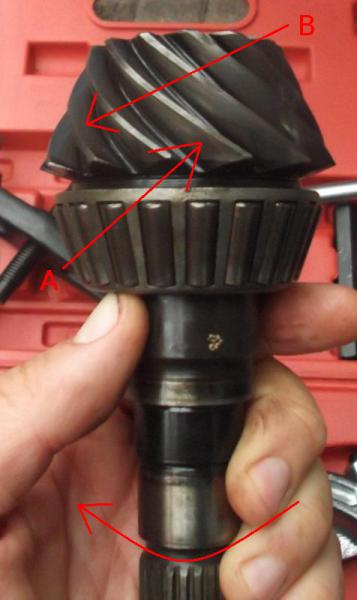 The faces of the teeth on the pinion and crown wheel are given the following names; dive and coast. The "drive" side is the side that is used the most - the forward "driven" side and the other side of the tooth is called the coast (although it is the driven side in reverse). For the crown wheel... http://www.peachparts.com/shopforum/...1&d=1390161925 ...the curved arrow shows the direction of rotation during normal forwards direction travel of the car. Arrow "A" points to the drive side of the tooth. Arrow "B" points to the coast side of the tooth. On the pinion... http://www.peachparts.com/shopforum/...1&d=1390161925 ...again the curved arrow shows the direction of rotation during normal forwards direction of travel of the car. As before arrow "A" points to the drive side and arrow "B" points to the coast side. Because these teeth need to roll over each other there needs to be a gap between them - if they were too tight they couldn't turn they would be solid / rigid. As you need this gap or clearance you get "backlash" between the contact of the teeth of these cogs. The pressure of this contact makes the pinion want to slide either towards or away from the crown wheel. For normal forwards driven direction of the car, the pinion gets dragged towards the larger tapered roller bearing - towards the crown wheel. In the other direction (in reverse) the pinion gets dragged towards the small tapered roller bearing - away from the crown wheel. So if you haven't tightened the nut on the end of the pinion / output shaft correctly the pinion shaft is going to shuttle back and forth whenever you press down or lift off the accelerator pedal knackering those two tapered roller bearings. These bearings need to have a correct pre-load to stop this from happening. If you over tighten the nut you add too great a pre-load and you shorten the life expectancy of the bearings. If you leave the nut too loose then you are likely to encourage the chance of allowing the pinion shaft to shuttle backwards and forwards which will cause impact damage and a knackered bearings. |