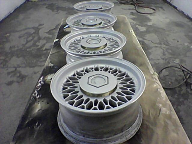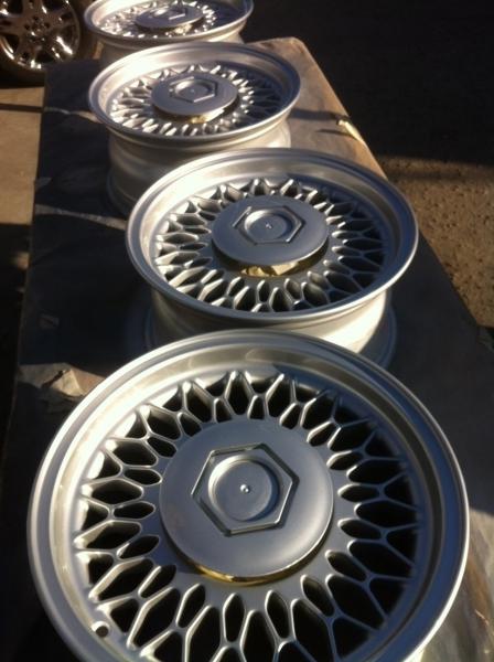Refinished the wheels on the BMW E34 yesterday. They were pretty rough, after 18 years of abuse, but after a lot of prep, they actually came out nicely...