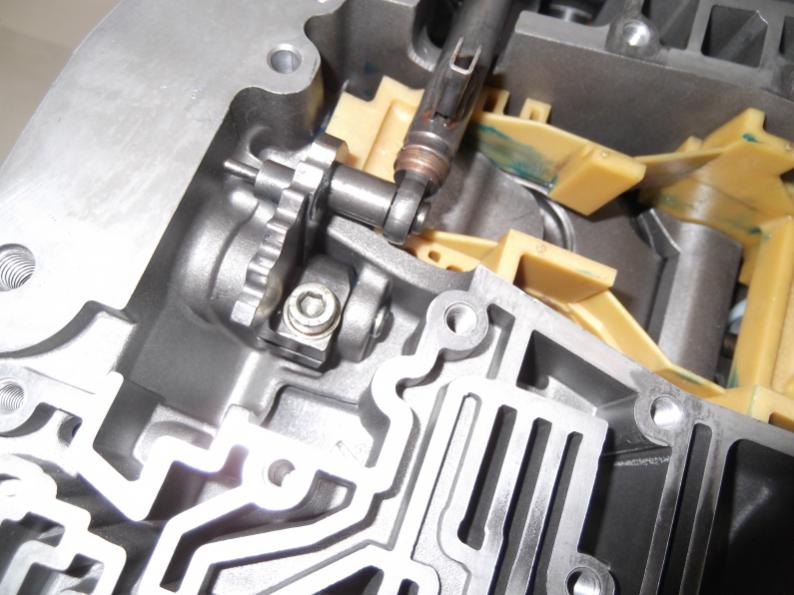 Ready to install the selector shaft ..new seal first install..comes in the master kit.. Then the shaft is installed and locked in place with the bolt..Make sure the system moves smoothly and you should be able to put the tranny in park by rotating the shaft towards the rear.. In the last pic..on the right edge, you can just see the piston and pin in place.