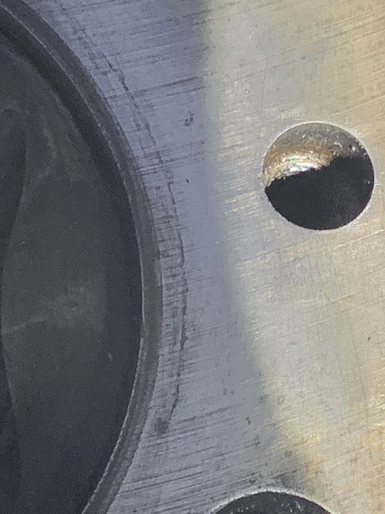 These are images of cylinder one on the fuel pump side. I cannot tell if this is just where the water jacket (?) meets the block or if this is an actual crack, or if it's where the head gasket sits so there is a mark etched there. It's quite difficult to get an image as it depends on angles and light, etc. These 3 are of the same area but each with different lighting.