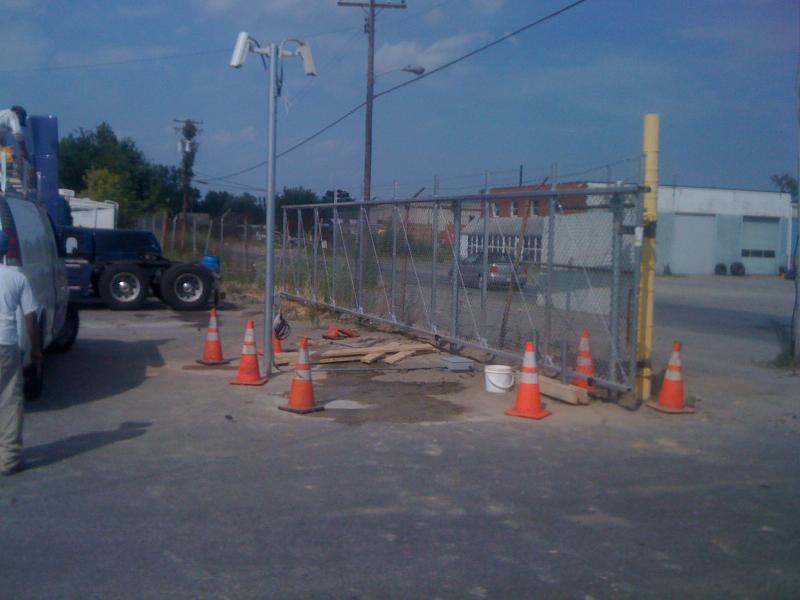 We picked the hottest day to put up the largest slide gate we ever installed. 42' slide gate ,7 foot tall 30 ' opening. Trucking terminal in E.Baltimore - seems one or two of the drivers made off with a container of NIKE shoes. Management decided to upgrade security new gate -card in ,card out and 16 decent cameras. |
