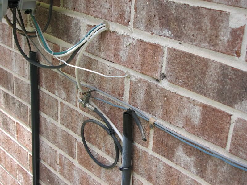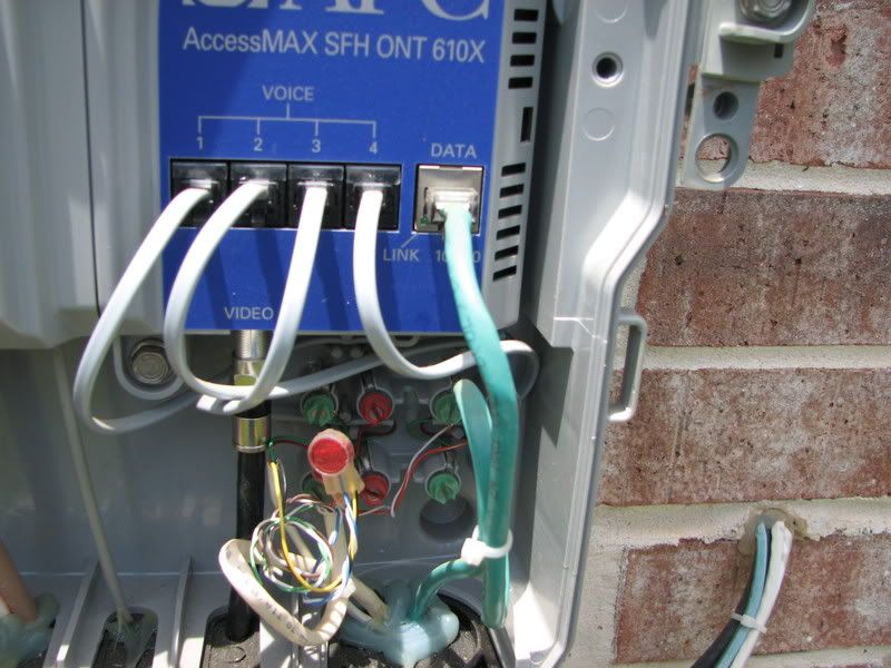 Sure enough, the copper going to the house was severed (vertical black conduit to the right). Also note the defunct coax cable from our FORMER service provider... ![]() A quick peek in the box shows that the existing phone line runs in the house are now connected to the FIOS cabling instead of the copper. ![]() A closer view: ![]() On the other side of the garage is the battery backup..so even if your PC, TVs, and cordless phones are dead due to a power failure, you can rest assured that your FIOS network is providing uninterrupted service! ![]() Our house is networked, but the box wasn't designed to house peripherals back when it was constructed. Maybe I should tackle this one as a project! ![]() Anyway, the black box is the ethernet/coax box that supplies the media connection, while the one above that is the ethernet router for broadband support. Verizon provided both units. ![]()