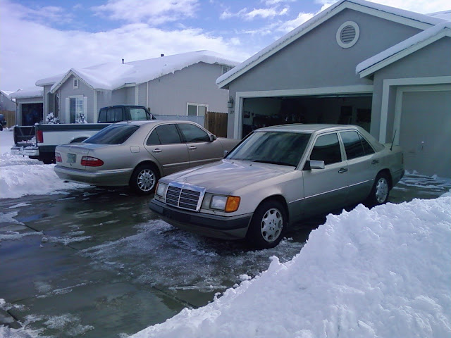 Having previously owning several (6 in all) BMWs, late 80s and early 90s 3 and 5 series, I decided to try a Merc. My first was a 93 190e 2.6 with close to 200k miles but very well maintained and clean. I did a stereo upgrade and added larger AMG Monoblocks and it drove great. But I missed the higher HP and 5 speed of my past bimmers. So I sold that and had this great 95 5 speed 525i After installing a performance chip and putting 20k miles on it I grew bored of having the same car (bad habit) and wanted a different one.Found a deal on a W202 96 Mercedes C280 Sport ![]() I was surprised on how quick it was and I like the style since the previous owner had put a trunk spoiler, CLK rims, and a Lorinser exhaust. I thought the interior was a great upgrade to my BMW 525i. ![]() ![]() I didn't like the big gap and no cup holder option that BMW decided to go with. I really enjoy the acceleration of the C280 but I wanted more HP and top end http://www.youtube.com/watch?v=kEXNQCRCPYQ So I sold the C-Class and got a W124 93 400E Pictured here with my sisters 2000 E320 4MATIC ![]() I've got say I do enjoy the 275 HP V8 for getting around cars that want to play blocking games or hog up the fast lane on the freeway, but I do think the 4 speed auto is lacking in the response department To testify in the W210 E320 4MATIC with 722.6 Manumatic transmission behalf, it is an absolute dream to drive in the snow with the proper tires (Michelin MVX I think they're called). When I had to drive from Nevada to California in the middle of a snow storm it blasted through at 40-50 mph effortlessly while others were crawling around at 10-20 mph speeds The only problems or week spots I see with the W210 is the faulty LED clock and outside temp displays in the cluster, the "Life Time" no dipstick transmission, and I did have to replace the passenger side front axle seal to the differential because it seeped fluid and it's tricky to install properly. My 400E, I found they upgraded the front brake rotors from 22.4mm thickness to 25mm in 11/92 (when my car was made) so I have to reorder the larger ones. I missed the coil packs of my 2.8 M104 engine vs the 4.2 M119 cap and rotor design although the 2.8 is just as quick off the line it can't carry you up to 150 mph like the 4.2 M119 can ![]() I just purchased the car and refreshed some fluids, new wiper, new head light doors, repaired the head light wipers, new Alpine stereo, and now tackling the brakes. So I'll give it some time before I provide a better opinion. First off I'm disappointed with the wimpy 15" 195/65 wheels, but smaller is better in the snow (no plow effect like with wider tires). I'll leave it until summer time to go to 16 or 17" rims. |