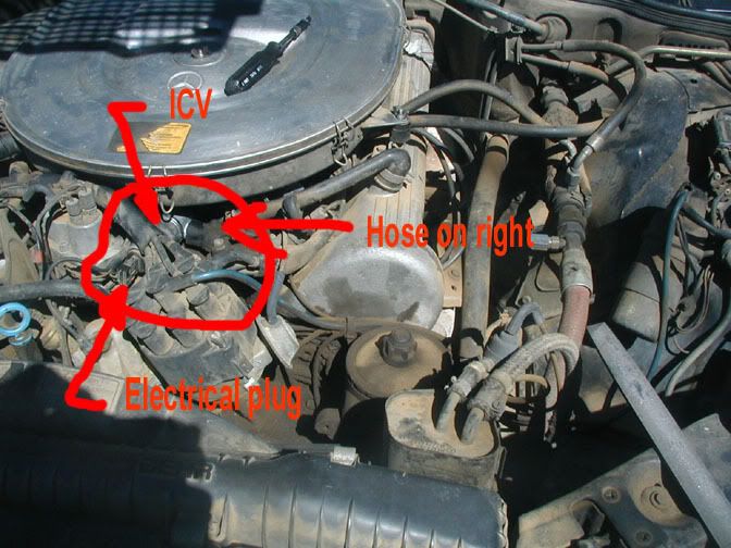 Looks like your ICV IS missing! That sure looks like the plug that goes on the end of the ICV!. And that is the location of the ICV.....What is the Cold Start valve large er black rubber hose connected to? and the tube that comes out of the manifold??? Possibly hooked to each other to bypass the ICV???