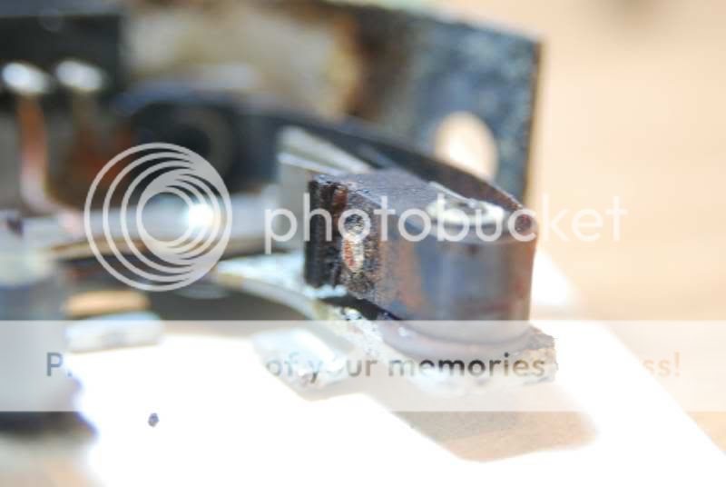 Simple idea really. Remove one half of the point sets (they can be removed by removing the circlip and sliding them out of their mounts. Make up a plate that will slip over the spindles the points rotate on. Scribe a line on the plate exactly on the centerline of the spindles. Scribe two additional lines parallel with this centerline such that they are the distance we would like the points to be apart. This can be determined from the cam min diameter plus a small amount (to be determined) Make up a lever tool with a slit at the end that will fit over the fixed part of the points. Slip it on, then bend the point plate so that the fiber slider will line up with the scribed marks. Do same for all 4 points. Put points back together and recheck opening angle for each set using ohmmeter. I am pretty sure this can be done. Just need to do it and work out the details! Once done, points should be good for another 100k miles ![]()