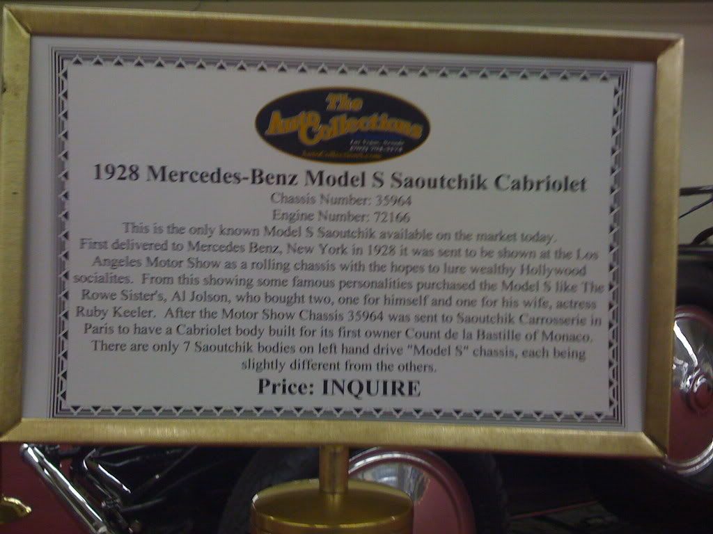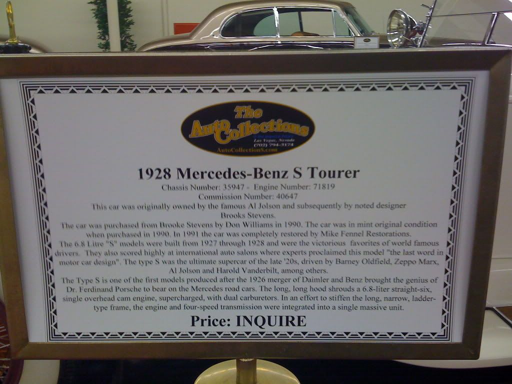 http://www.imperialpalace.com/casinos/imperial-palace/casino-misc/auto-collections-detail.html I apologize for the poor quality photos, but since this was an impromptu trip, I only had my Iphone for photographs. The Benzes: Gull Wing for 750,000 ![]() ![]() Driver Quality Pagoda: $39,000 ![]() ![]() Then came the two mind blowing cars so expensive that you have to request the price... ![]() ![]() ![]() ![]() ![]() ![]() ![]() ![]() ![]() ![]()