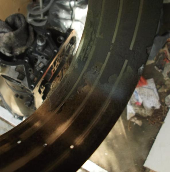I didn't get much of a chance to do anything today. I just took some pictures of the damage. I've got a feeling this transmission will be a rubber necker's paradise. First off here's the worn to the metal B1 brake band http://www.peachparts.com/shopforum/...1&d=1345390520 I reckon they should have kept on driving it to see if it would eventually polish to a mirror finish. Here's probably why the output shaft felt a bit rough http://www.peachparts.com/shopforum/...1&d=1345390623 Really nasty pitted surface on the bit where the park pawl fits (I'll have to RTFM and find out what it is actually called!) http://www.peachparts.com/shopforum/...1&d=1345390691 Rusty governor http://www.peachparts.com/shopforum/...1&d=1345390790 It also has some spectacularly sharp edges on the drive cog. As does the cog that goes on the output shaft. http://www.peachparts.com/shopforum/...1&d=1345390849 Look closely in the picture above - the middle part of the teeth are sharpened (by wear) - they are thinner than the outer edges. I think I might have to ask the moderators to rename this thread to "what can possibly go wrong with a 722.3!" |