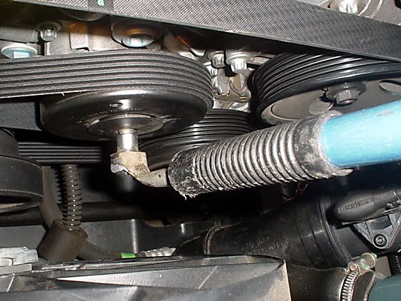 As far as the coolant surely running all out....didn't think that would be possible with so many lower pipes, hoses, lower radiator and the block itself.... But, it seems that you are correct as I started to bleed the system and only saw pink.....no old yeller coming out...not sure if when I started it that any old yeller from other low spots wasn't mixed.... Anyway, seems to be fine now so going to go for a while before flushing... The tension pulley is different then most as it does NOT have a small rod coming out from the pulley like the above pic posted with the nice wrench to move the tensioning device.... With this model you must take the tension pulley off, or push on the pulley iteself which is not too safe... |