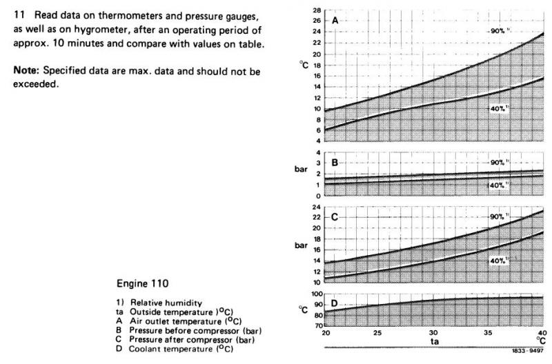 With this recent warm up, I've decided to go through the cars and check AC systems. Much to my surprise my 190E's works, in the past it had leaked out and stopped working. However my 420SEL's is not working so well. The compressor kicks on, I put the manifold on it and got 60 PSI static pressure, with engine on readings with the aux fan on and ambient temp at front of radiator about 80F: According to charts at 80F ambient one should see ~18 Low, 170-210 High. I saw, At Idle: 3 Psi Low, 100 Psi High At 1500 RPM: 0 Psi Low, 100 Psi High So I felt that the charge was low, so I grabbed a can of R12 and started charging. Idle: 20 low, 165 High 1500: 10 low, 165 High I checked the gauge I put in the center vents, it was hitting high 60s. So I thought it was still undercharged a bit. I think I overcharged a bit, I ended up with: Idle: 30 low, 175 High 1500: 17 Low, 180 High That's a question I have about these charts are these pressures at idle or at a higher rpm? What do you guys think? EDIT: After a short trip (~40mph speed) I achieved about 55F at the center vents with my cheapo dial thermometer. EDIT: Did another run on the freeway, used my DMM with temp sensor, lowest was 56F. Sat between 56-58F.