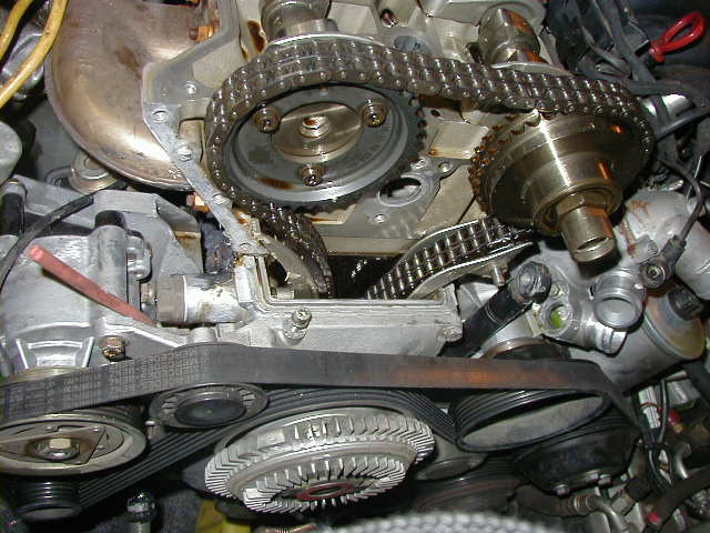 Followup: Well I bought the Permatex Right Stuff sealer and applied it where the leak is. It didn't work and the leak came back. So I decided to replace the head gasket. But wait, before I do that I'd like to hear some opinions. I have attached a picture of the engine from where I am now. After further carefull checks, I could not find any leak coming out of the head gasket (front corner as I stated on my original post). The front seal was already replaced three years ago but that did not solve the problem in the first place so, I just live with it. Now I decided to find out what really causing this messy leak. Any idea on where the leak is coming? I hope the picture will help. |