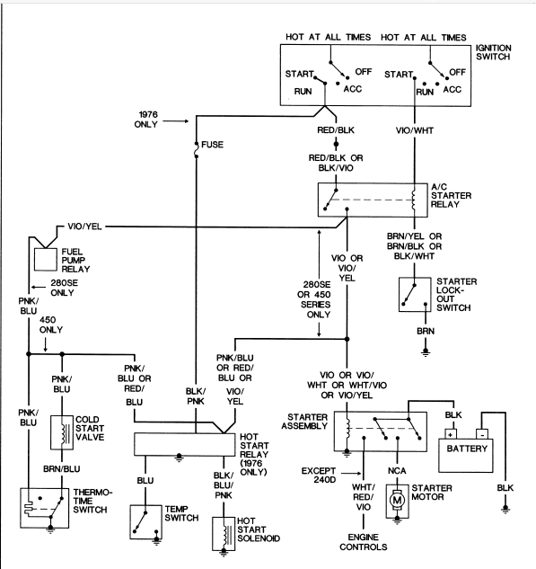 I really don't think the fault is the k-jet. I'm starting to think that the only reason it has started is because the fuel pump is on during start. And doesn't stay on in "Run" So I'm gonna start by looking for the fuse and go from there. Not sure about the vacuum going to the warmup regulator. And swapping them had no effect. So I'm confused, 1976 hooked up one way, 1979 hooked up the other possible way. Now, the 79 didn't really run all to well, so maybe I should put it back the way I found it, something my parents always told me to do. Anyone know which way it's supposed to be hooked up? The attached schematic. When the switch is in Start position, the relay labeled A/C starter relay is energized. When this happens the fuel pump is getting 12v through the A/C starter relay (which I believe also disconnects the A/C compressor) But when the ignition switch is in "Run" position, if the fuse is blown, the car will start and stall after consuming the fuel from the cold start valve.